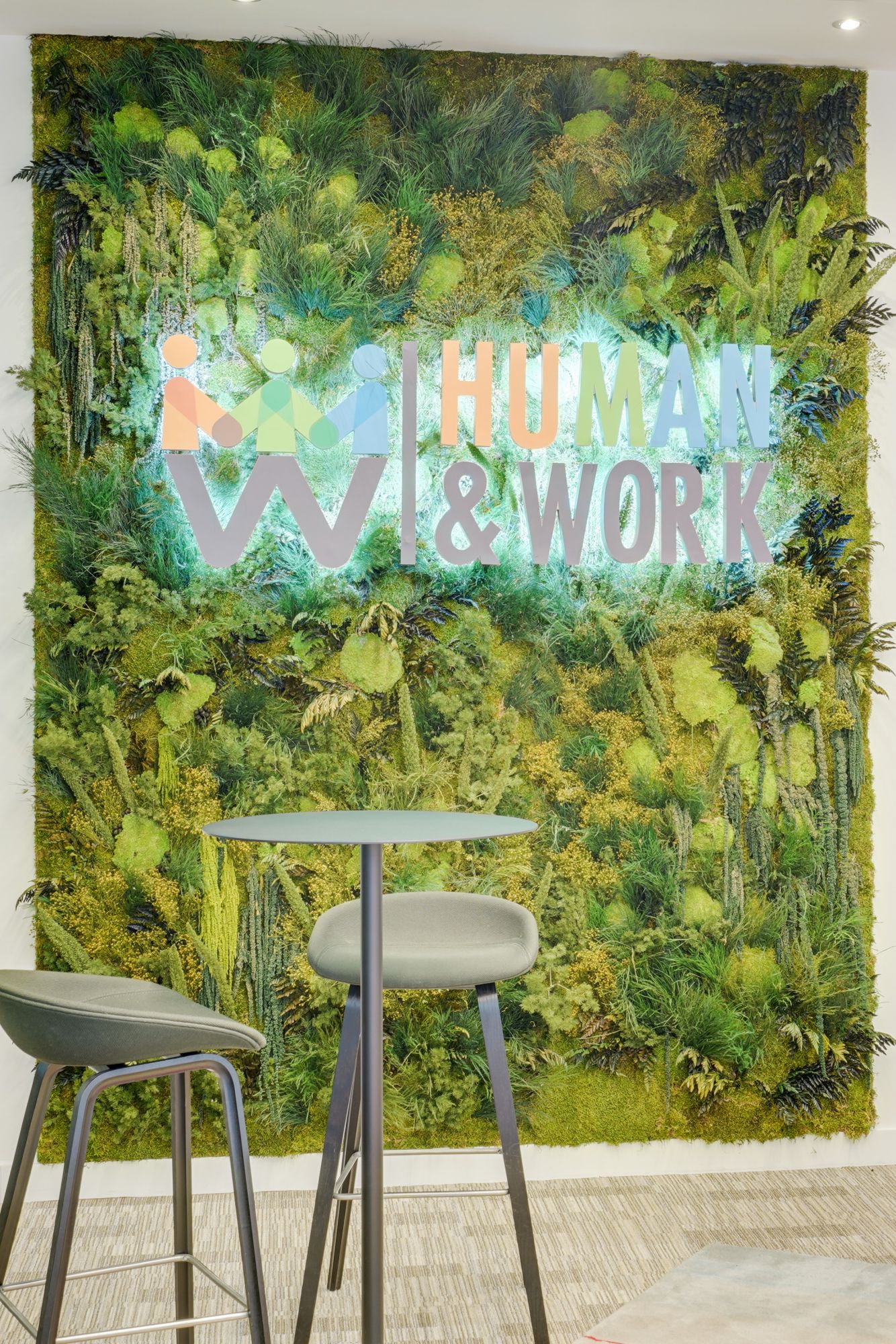 Le logo de Human & Work Group sur fond végétal